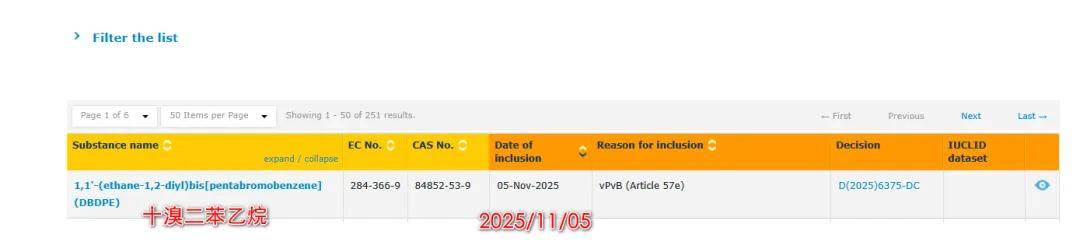 2025年11月5日,ECHA官网正式将十溴二苯乙烷列入SVHC候选物质清单。
