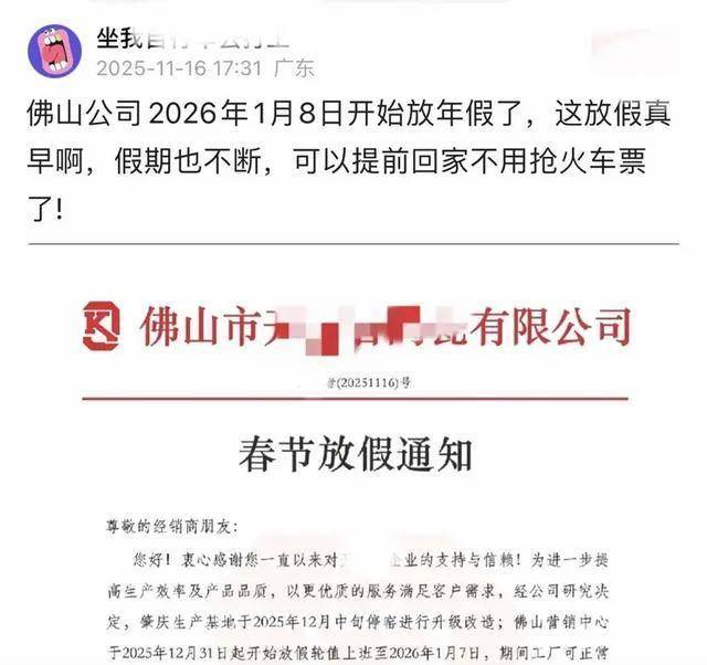 PG电子(Pocket Games Soft )全球首屈一指的电子游戏供货商[永久网址:363050.com],首位跨足线下线上电子游戏开发。PG电子,pg娱乐,PG电子试玩平台,PG电子技巧,PG电子下载,欢迎注册体验!近日,一网友在网上吐槽,广东佛山的这家公司于2026年1月18日就开始放年假了。这位博主称这个年假也太早了吧!