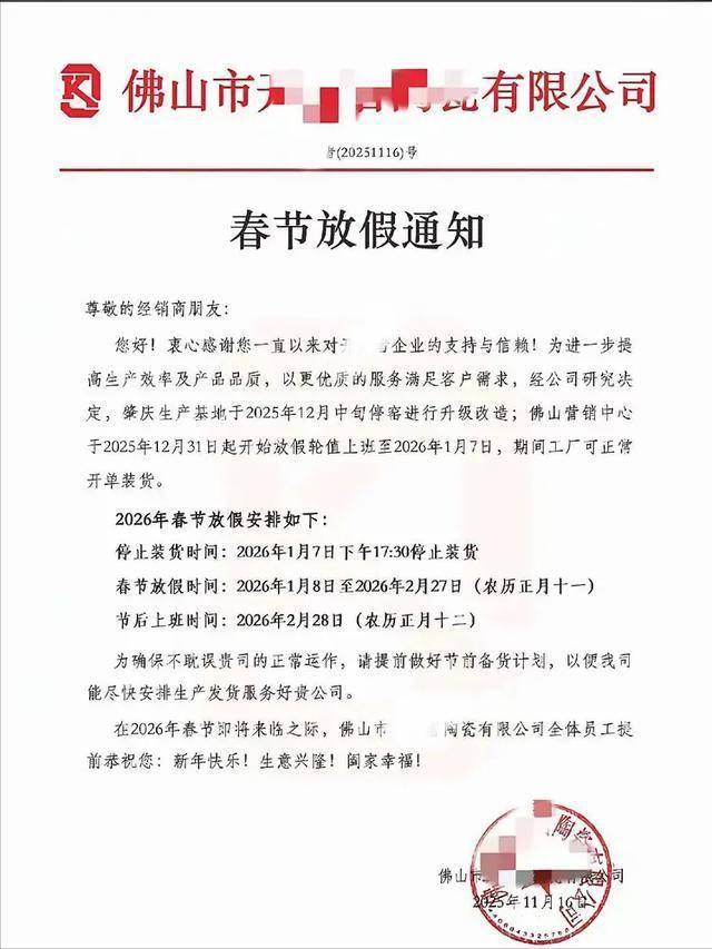 2026年1月8日开始放假,2月27日开始上班。这家公司提前一个月做出春节放假安排,放假时间长达近2个月,这真的是陶瓷业的冬天真的要来了吗?