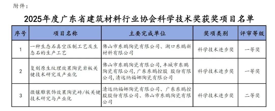 近日,2025年度广东省建筑材料行业协会科学技术奖获奖名单正式揭晓。东鹏控股凭借多领域的技术突破与产业化成果,一举包揽三项重磅奖项——两项一等奖和一项二等奖,成为本届评选中获得科学技术进步奖一等奖数量最多的企业,彰显了其在建筑陶瓷行业持续领先的科技创新实力。