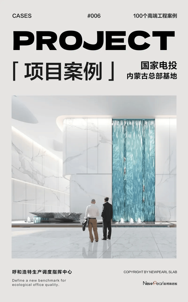 在国家“双碳”战略的宏大蓝图下,草原青城呼和浩特正加速汇聚绿色创新动能。作为国家电投集团在内蒙古区域发展的核心引擎,国家电投集团内蒙古能源有限公司肩负着“创造绿色价值”的使命,全力奔赴“建设世界一流清洁综合能源企业”的战略目标。在此背景下,总建筑面积达53000平方米的呼和浩特生产调度指挥中心应运而生。项目以“国际化、低碳化、智能化”的理念为指引,秉持创新智慧与低碳生态的愿景,充分依托国家电投在清洁能源领域的优势,采用先进的技术手段与管理平台,全面激发科研办公的发展潜力。其目标在于打造一个集办公、研发、展示、研讨、指挥调度于一体的国家电投区域总部建设标杆示范及自治区低碳建筑示范。面对这一承载着未来愿景的标杆工程,新明珠岩板凭借其卓越的产品性能与系统化的空间解决方案能力脱颖而出,以材质赋能建筑,共同诠释绿色低碳综合办公体的未来形态。呼和浩特生产调度指挥中心的建筑设计围绕生态主题,结合企业标志形象,形成了效率与体验全维度融合的自然生态滨水门户。在这一设计理念下,新明珠岩板·冰川印象以其独特的自然美学语言,成为了诠释空间气质的最佳载体。