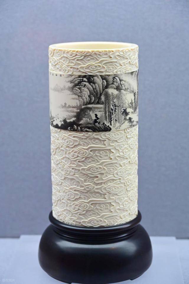 更难得的是,这件竹雕笔筒的创作,没有局限于传统山水题材,而是融入了文人雅士的生活场景,展现了中国传统文化中“隐居山林、淡泊名利”的清雅意境。在快节奏的当下,这样的作品,仿佛能让人静下心来,远离城市的喧嚣,感受传统文化的宁静与美好。竹雕艺术虽然小众,但它承载着中国传统文化的内涵,彰显着手艺人的匠心,是中国工艺美术不可或缺的重要组成部分。此次展览将竹雕作品纳入其中,也体现了对小众工艺美术品类的重视,让更多人了解竹雕艺术,关注小众老手艺的传承与发展。